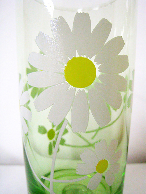 薄い緑のガラスに昭和らしい花柄・・・。