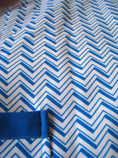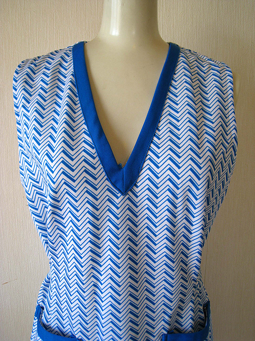 胸元のV字と、バストを立体的に見せる紺のラインがシャープな印象!