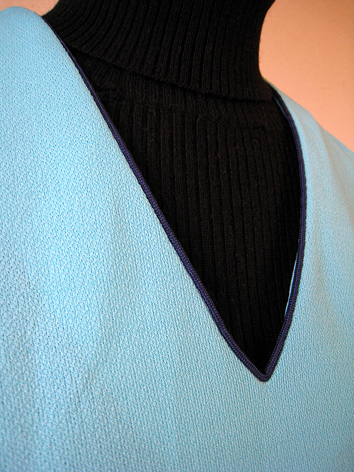 胸元のV字と、バストを立体的に見せる紺のラインがシャープな印象!
