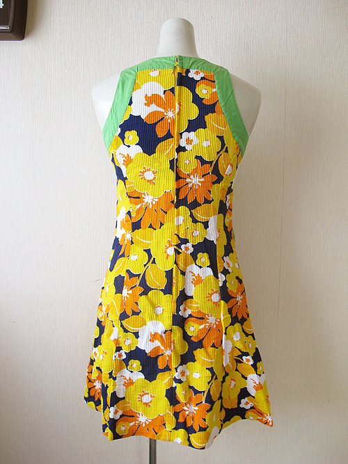 オレンジのレトロな花柄に、襟、袖、ポケットの緑のレトロな配色がキュート☆