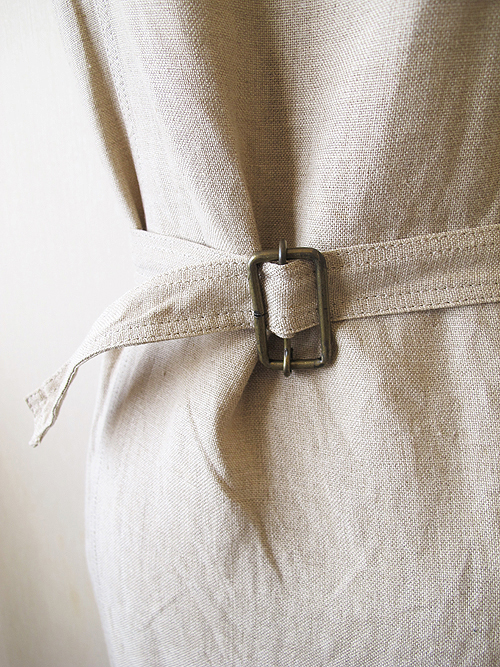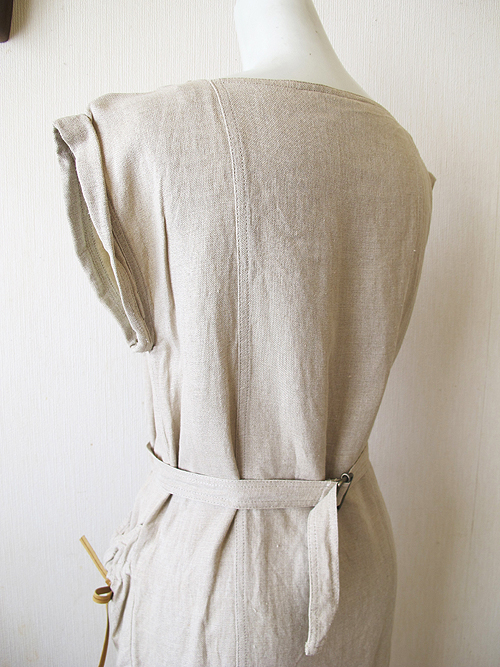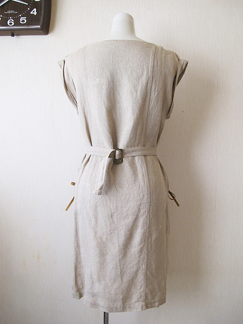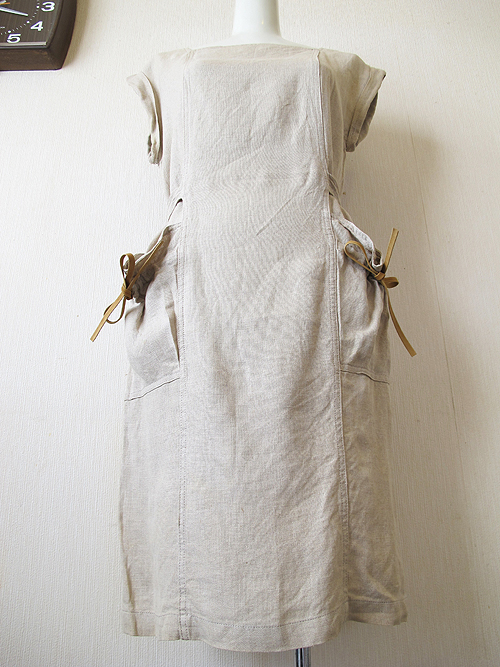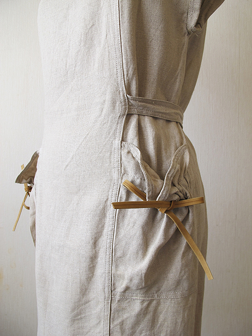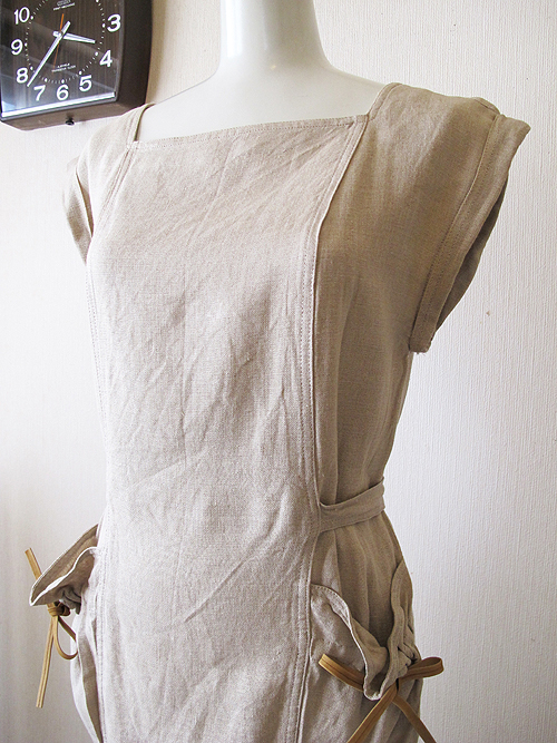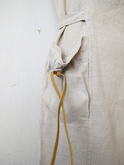 スクエアーネックや後ろで止めるベルト、紐のリボンが付いたポケットもアクセントになっていて落ち着いた中にも可愛らしさも感じさせてくれるワンピースです。